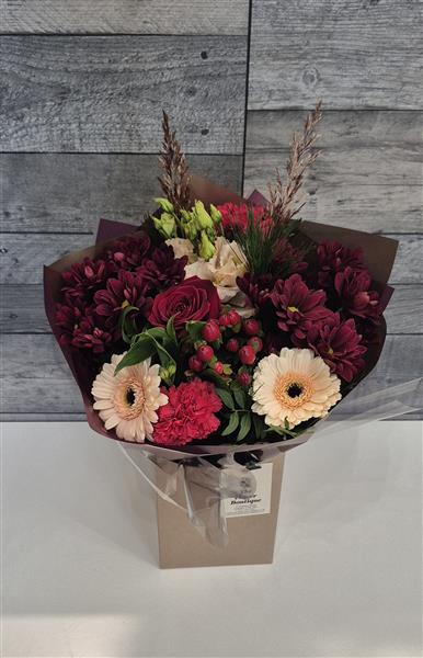 Petite gift box of rich reds, peach and copper. wrapped in mulberry and copper cellophane and presented in a kraft box
