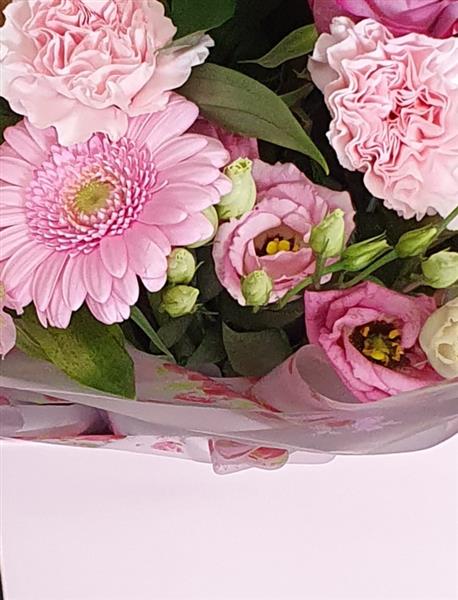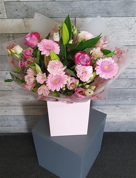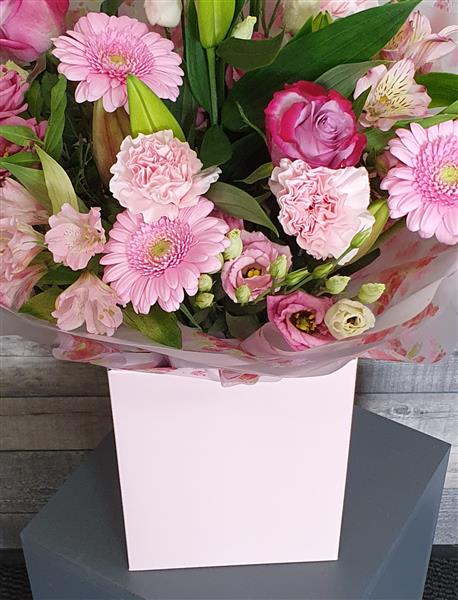 Beautiful selection of flowers in pink shades, wrapped in complimentary cellophane and presented in a co-ordinated gift box