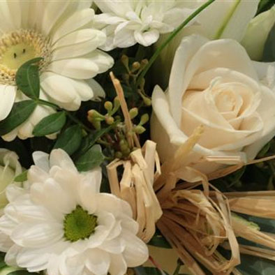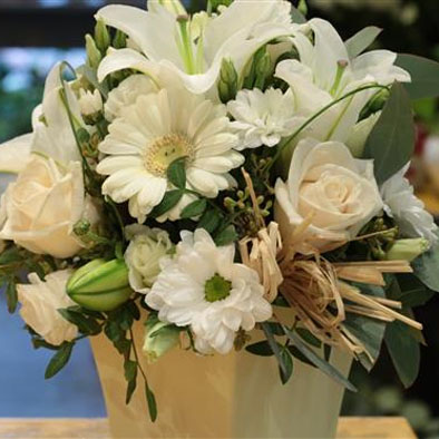 Classic whites and creams including scented lilies, roses, gerberas and chrysanthemums are used to create this dainty arrangement.