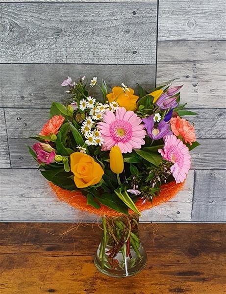 colourful display of mixed seasonal flowers arranged in a glass vase